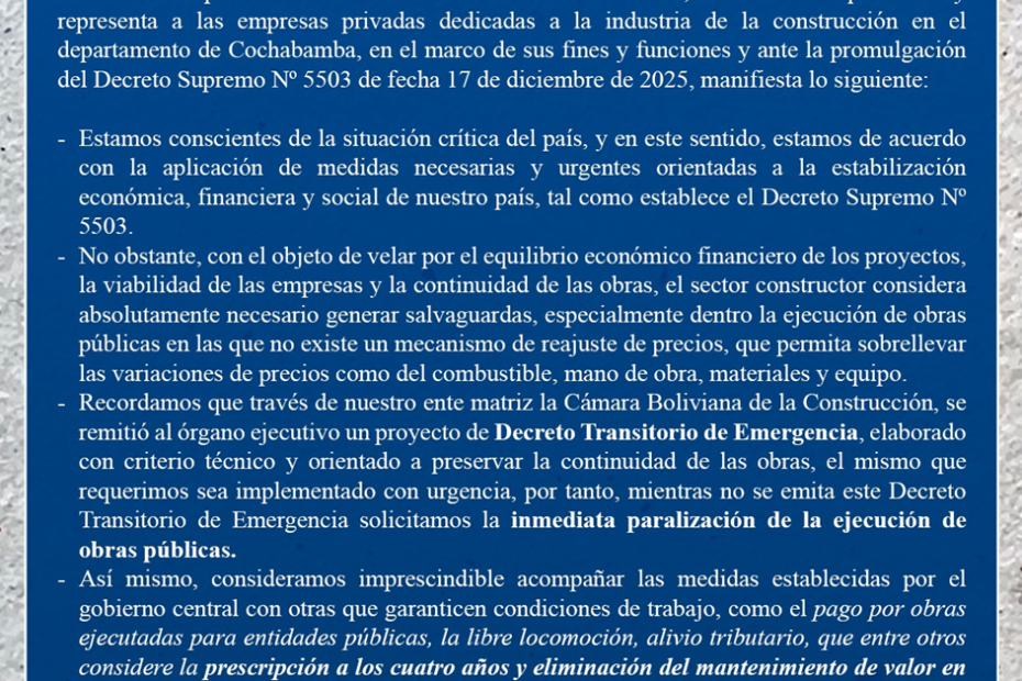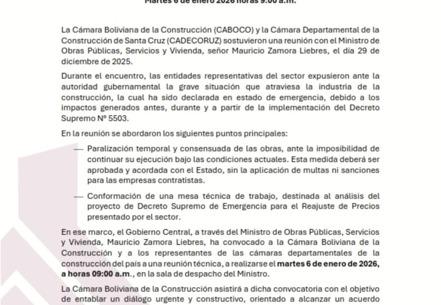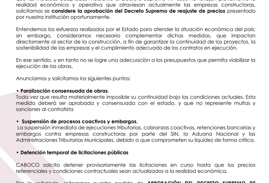 La Cámara Boliviana de la Construcción (CABOCO) y las Cámaras Departamentales de la Construcción, promovimos un Proyecto de Decreto Supremo de Reactivación Económica del Sector, presentado a las autoridades del Estado y trabajado de manera conjunta con el Ministerio de Obras Públicas, Servicios y Vivienda.