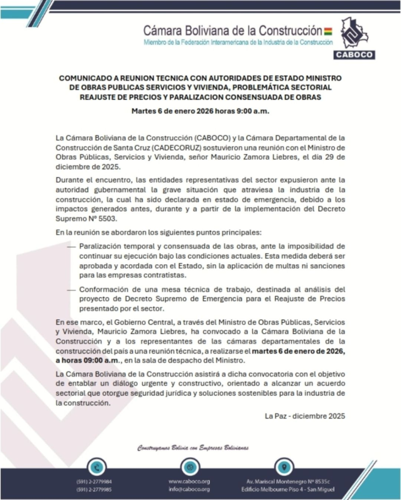 COMUNICADO CABOCO A REUNIÓN TÉCNICA CON AUTORIDADES DE ESTADO MINISTRO DE OBRAS PÚBLICAS SERVICIOS Y VIVIENDA, PROBLEMÁTICA SECTORIAL REAJUSTE DE PRECIOS Y PARALIZACIÓN CONSENSUADA DE OBRAS