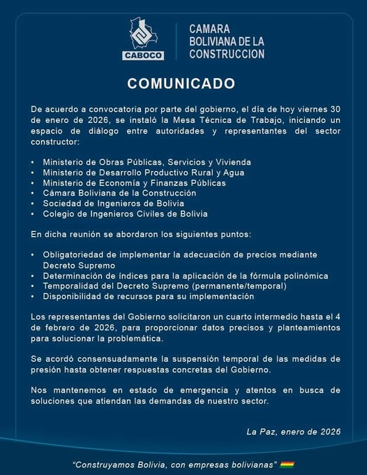 COMUNICADO CAMARA BOLIVIANA DE LA CONSTRUCCIÓN