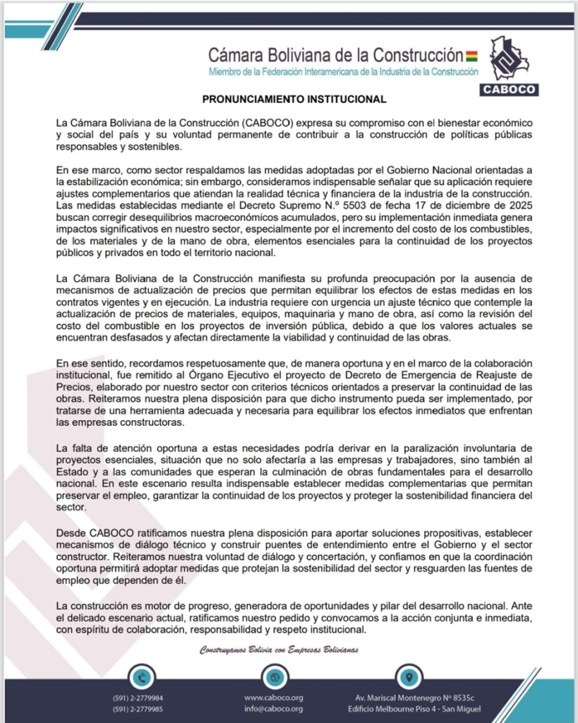 PRONUNCIAMIENTO INSTITUCIONAL CABOCO RESPECTO AL D.S. N° 5503